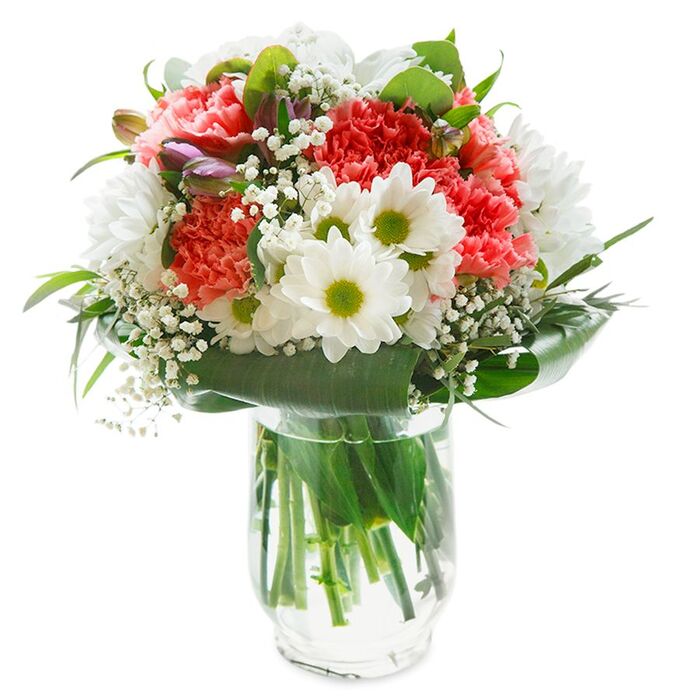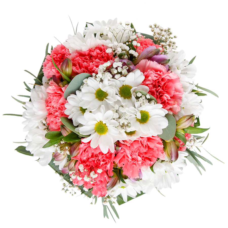 Express your affection with our beautifully crafted spring bouquet. This unique arrangement features snow-white chrysanthemums, fluffy gypsophila, vibrant light pink carnations, and lush aspidistra leaves, creating a stunning visual appeal.